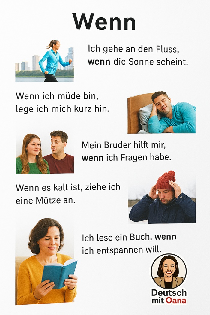 „Wenn” este conjuncție temporală în germană, echivalentă cu „când” în română. În propozițiile subordonate introduse de „wenn”, verbul la final!
